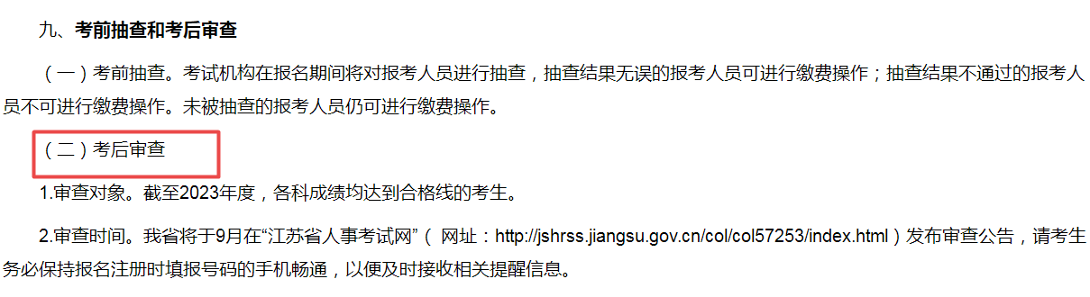 2.审查时间。我省将于9月在“江苏省人事考试网”( 网址:http://jshrss.jiangsu.gov.cn/col/col57253/index.html)发布审查公告,请考生务必保持报名注册时填报号码的手机畅通,以便及时接收相关提醒信息。