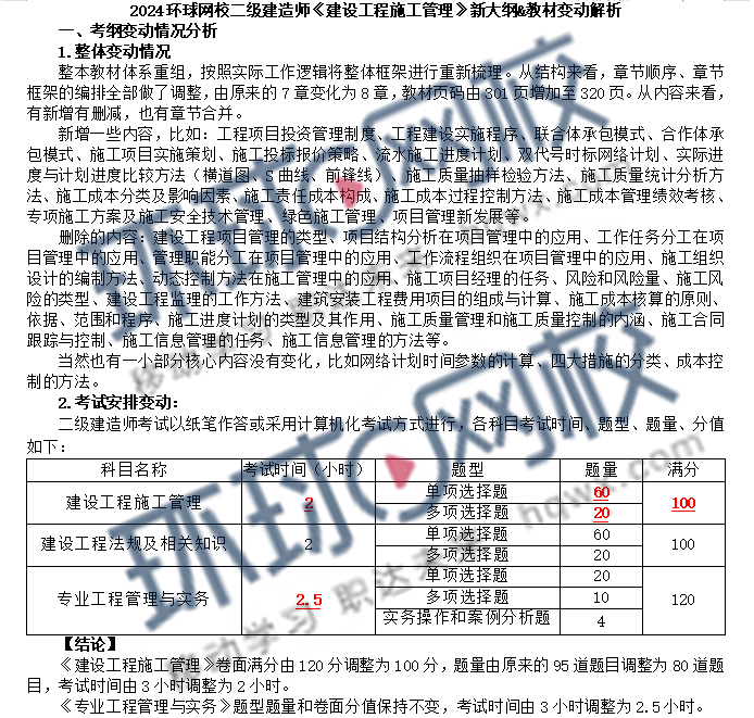 2024二级建造师《建设工程施工管理》卷面满分由120分调整为100分,题量由原来的95道题目调整为80道题目,考试时间由3小时调整为2小时。,整本教材体系重组,按照实际工作逻辑将整体框架进行重新梳理。从结构来看,章节顺序、章节框架的编排全部做了调整,由原来的7章变化为8章,教材页码由301页增加至320页。从内容来看,有新增有删减,也有章节合并。