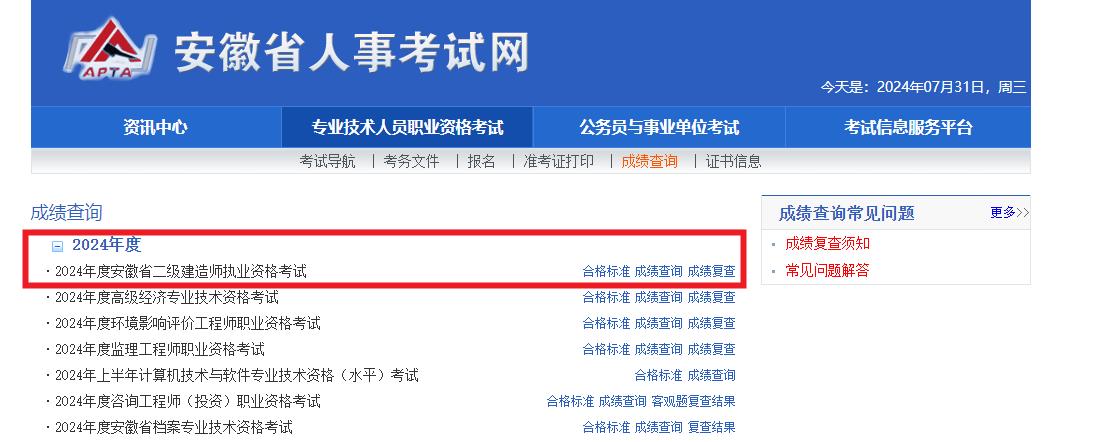 2024年安徽二级建造师成绩查询官网:安徽省人事考试网(http://www.apta.gov.cn/ProfTech_ExamScore)