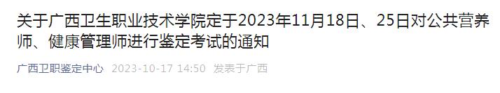 广西卫生职业技术学院职业技能培训学院定于2023年11月18日、25日面对全区开展公共营养师三级、健康管理师三级职业技能等级鉴定。现将有关事项通知如下: