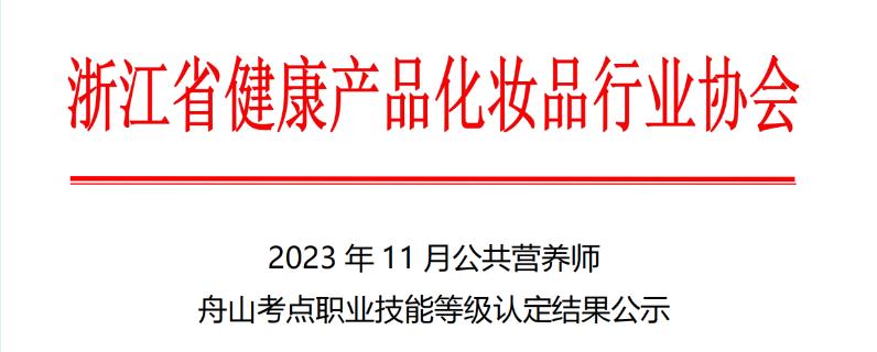 根据2023年11月13日浙江省健康产品化妆品行业协会发布的《2023年11月公共营养师舟山考点职业技能等级认定结果公示》得知,2023年11月4日组织的公共营养师(三级)职业技能等级认定考试通过名单已公布,公示时间为2023年11月13日至17日。