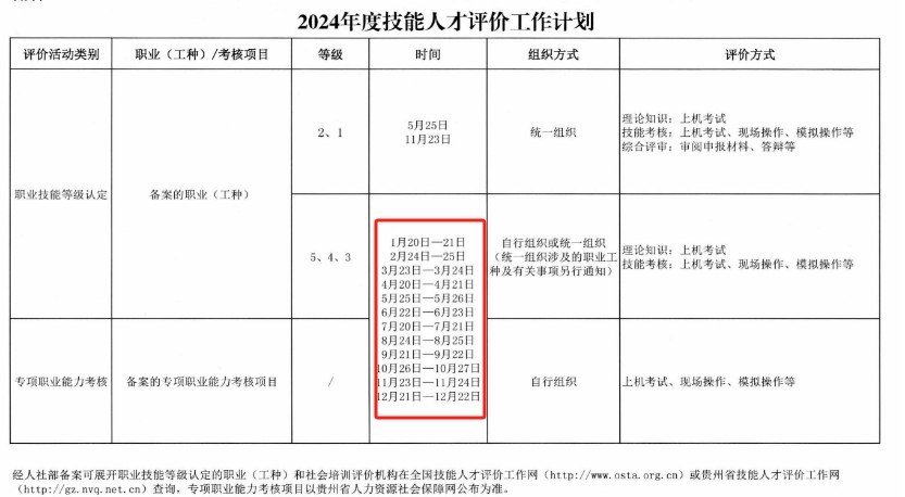 注:以上认定按各工种各等级申报参加人数及当月具体情况开展评价工作,如遇特殊情况考试时间另行通知。