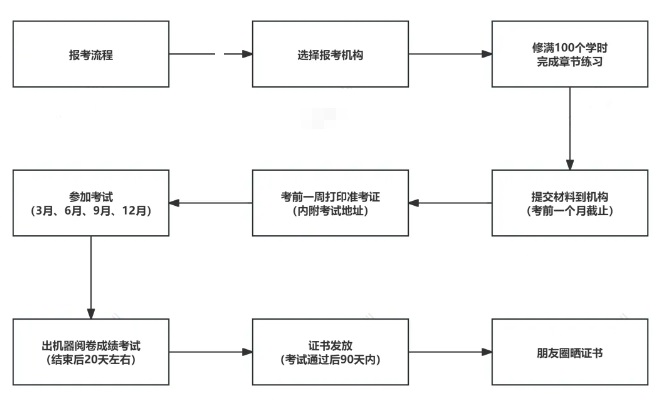 4.报名考证流程:咨询机构→填报信息→报名缴费→备考(课程+题库+教材)→考试通知→正式报考→打印准考证→考试拿证。
