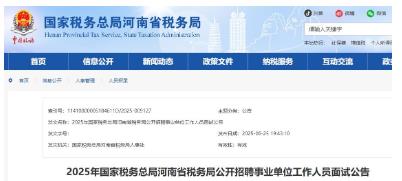 根据《河南省事业单位公开招聘工作规程》《2025年河南省事业单位公开招聘联考工作的公告》《国家税务总局河南省税务局2025年公开招聘事业单位工作人员公告》有关规定,现将国家税务总局河南省税务局2025年公开招聘事业单位工作人员面试有关事项通知如下: