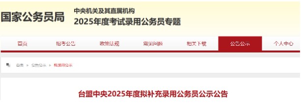 国家公务员补录网站发布台盟中央2025年度拟补充录用公务员公示,确定张晓冬同志为拟录用人选。本文详解补录流程、报名条件及2026国考备考资源领取方式。