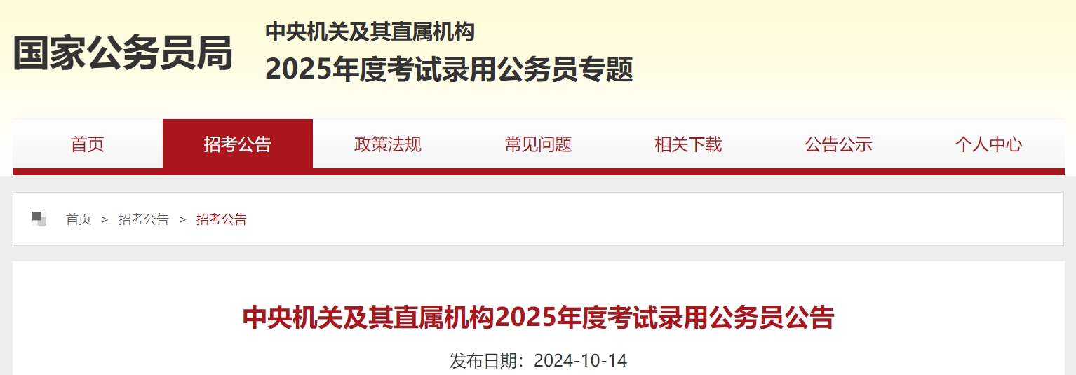 国家公务员局于2024年10月14日发布《中央机关及其直属机构2025年度考试录用公务员公告》,2025年国家公务员考试于2024年12月1日进行,报考条件、报考程序、考试内容等需要考生认真阅读,提前明确。