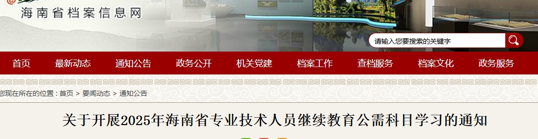 2025年海南省专业技术人员继续教育公需科目学习的通知 (详见:https://www.hainan.gov.cn/szfbgt/sdaj/tzgg/202504/ab797f9aa3b64fc9acb55ea1a60d4e6a.shtml)