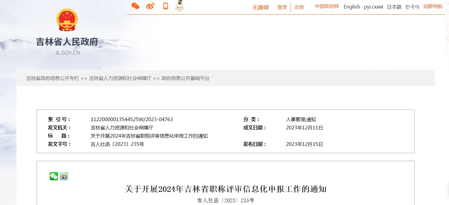 关于开展2024年吉林省职称评审信息化申报工作的通知