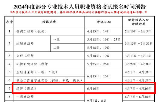 根据中国人事考试网通知得知,2024年高级经济师报名时间已确定!报名定于2024年4月7日-4月26日进行,考试定于2024年6月16日举行。