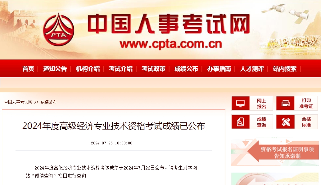 2024年度高级经济专业技术资格考试成绩于2024年7月26日公布。请考生到本网站“成绩查询”栏目进行查询。