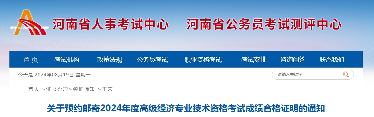 关于预约邮寄2024年度高级经济专业技术资格考试成绩合格证明的通知