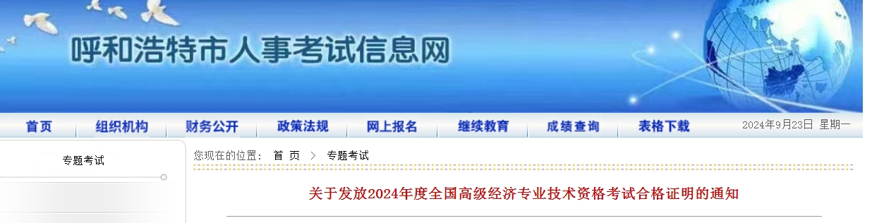 内蒙古呼和浩特2024年高级经济考试合格证明发放通知