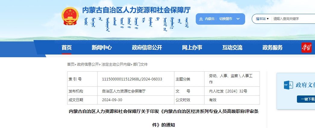 根据内蒙古自治区人力资源和社会保障厅发布的《内蒙古自治区经济系列专业人员高级职称评审条件》可知,内蒙古自治区经济系列专业人员高级职称评审条件 内人社发〔2024〕32号,自印发之日起施行。