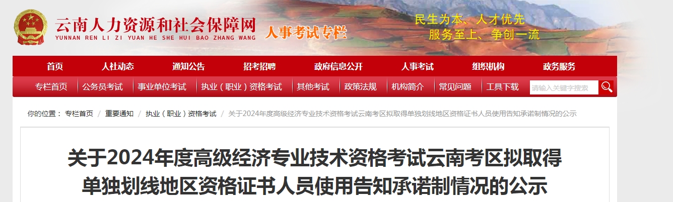 关于2024年度高级经济专业技术资格考试云南考区拟取得单独划线地区资格证书人员使用告知承诺制情况的公示