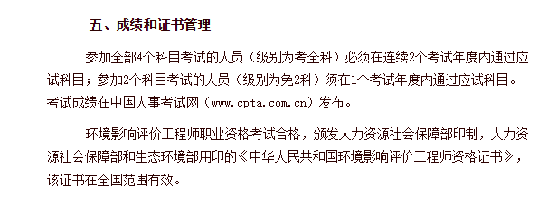 对于参加全部4个科目考试(即考全科)的考生,成绩实行滚动管理,滚动周期为两年。也就是说,考生需要在连续的两个考试年度内,通过《环境影响评价相关法律法规》《环境影响评价技术导则与标准》《环境影响评价技术方法》和《环境影响评价案例分析》这全部四门应试科目,才能获得环境影响评价工程师职业资格证书。例如,考生小张在2024 年顺利通过了《环境影响评价相关法律法规》和《环境影响评价技术导则与标准》,那么在2025年,他必须通过剩余的《环境影响评价技术方法》和《环境影响评价案例分析》,方可取证;若2025年有科目未通过,到2026年时,2024年已通过的两门科目的成绩将不再有效,小张需要重新报考失效科目以及2025年未通过的科目。