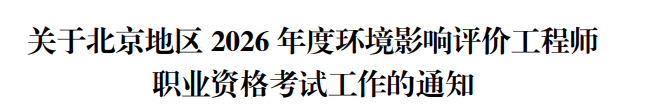 根据原北京市人事局、原北京市环境保护局《关于贯彻执行〈环境影响评价工程师职业资格制度暂行规定〉、〈环境影响评价工程师职业资格考试实施办法〉的通知》(京人发〔2004〕66 号),人力资源和社会保障部人事考试中心《关于2026年度环境影响评价工程师职业资格考试考务工作的通知》(人考中心函〔2026〕 6 号)精神,现将北京地区2026年度环境影响评价工程师职业资格考试有关事宜通知如下: