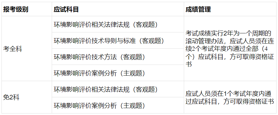 (二)截止2003年12月31日前,长期在环境影响评价岗位上工作,并符合下列条件之一的,可免试《环境影响评价技术导则与标准》和《环境影响评价技术方法》2个科目,只参加《环境影响评价相关法律法规》和《环境影响评价案例分析》2个科目的考试。