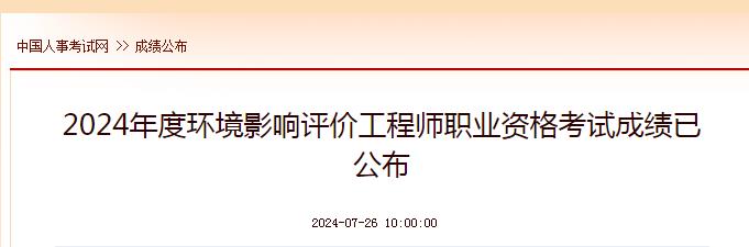 根据中国人事考试网7月26日发布的《2024年度环境影响评价工程师职业资格考试成绩已公布》得知,2024年环境影响评价工程师成绩查询时间:7月26日,请各位考生按要求查分。