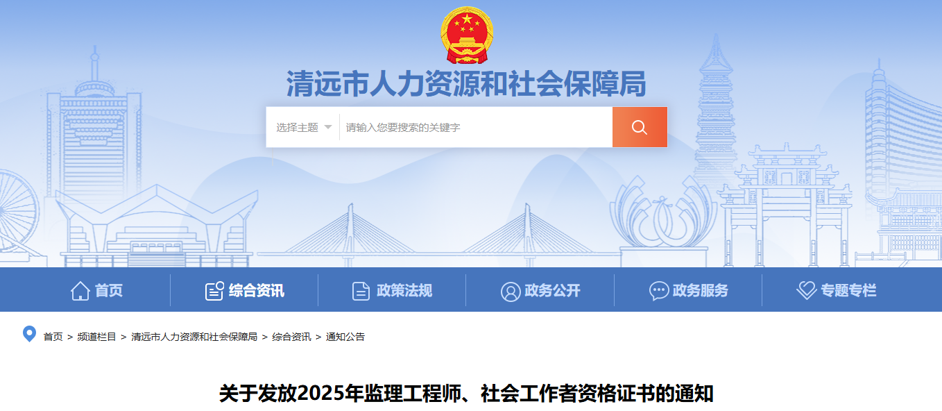9月5日,清远市人力资源和社会保障局发布了“关于发放2025年监理工程师资格证书的通知”,证书持有人可选择现场、政务云柜领取或网上申请邮寄领取。