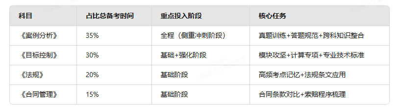 考生可根据自身基础调整:若为工程专业背景,可适当减少《目标控制》时间,增加《案例分析》实战训练;若为零基础,建议优先攻克基础科目,再逐步挑战难点。
