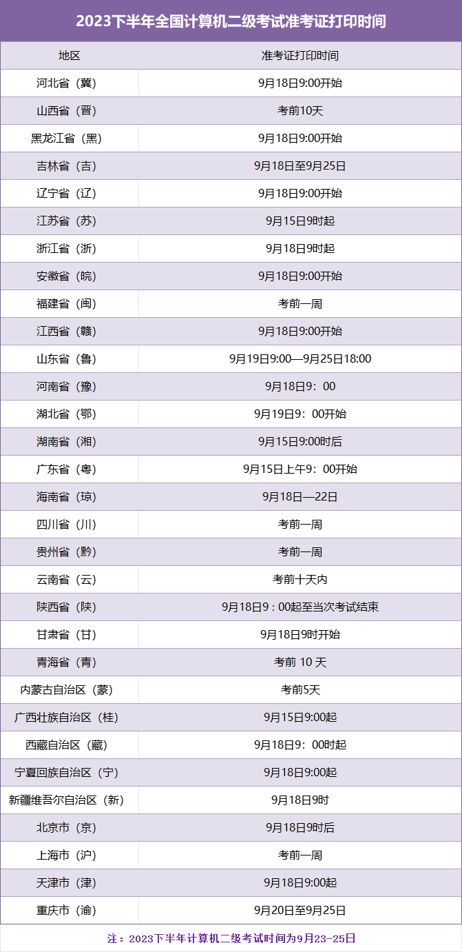 2023年下半年的计算机二级考试将于9月23-25日举行,考试之前,大家一定要确保检查好相应考试凭证。准考证作为重要参考凭证之一,务必在规定时间内完成打印。为了帮助大家及时打印,小编整理了全国各省市2023年下半年的计算机二级准考证打印时间,一起来看看吧。