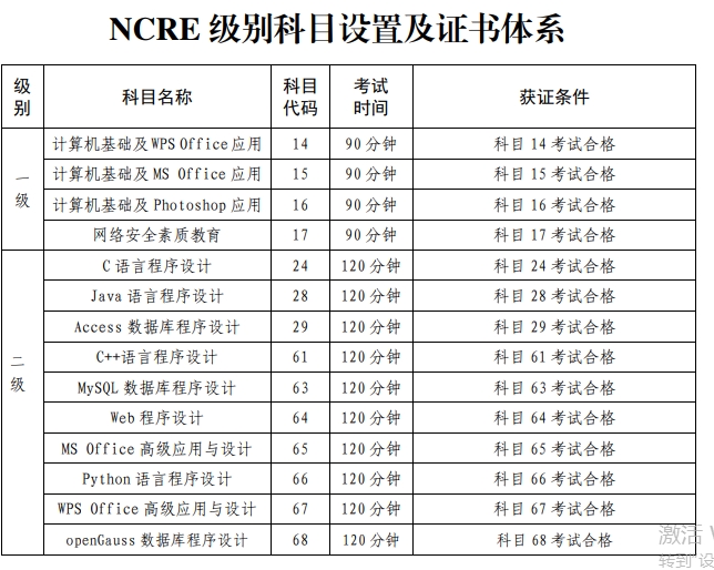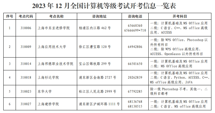 2023年12月(第71次)全国计算机等级考试(NCRE)将于12月2日(星期六)至12月3日(星期日)举行,开考部分一、二级科目,相关级别的证书种类、科目代码和获证条件详见《NCRE级别科目设置及证书体系》(附件1),现将上海地区报名有关事项公告如下: