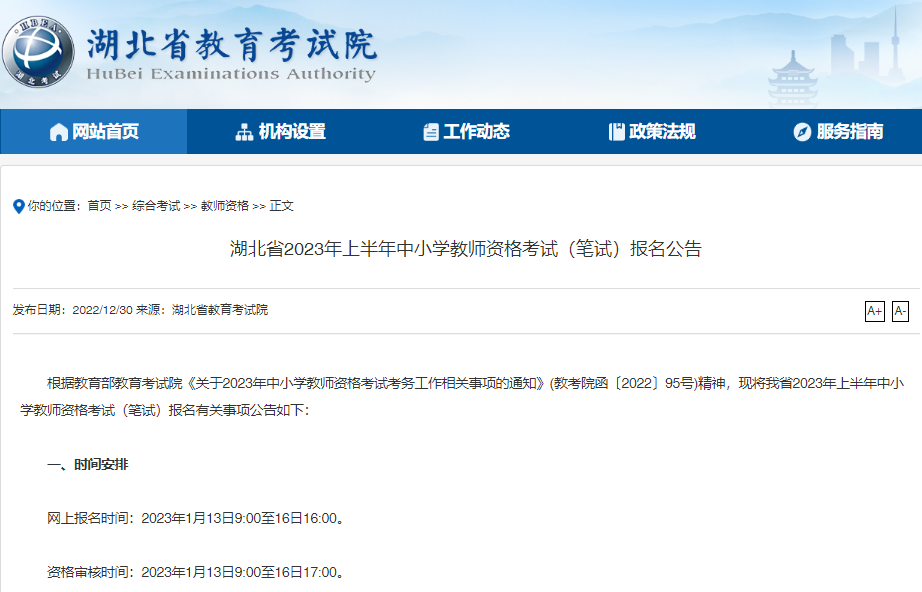 湖北省教育考试院近日发布了《湖北省2023年上半年中小学教师资格考试(笔试)报名公告》,当中明确了湖北省2023年上半年中小学教师资格考试(笔试)报名时间2023年1月13日9:00至16日16:00,提醒准备报名的考生按时按流程报名。