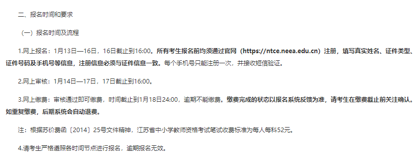 1月13日—16日,16日截止到16:00.所有考生报名前均须通过官网(https://ntce.neea.edu.cn)注册,填写真实姓名、证件类型、证件号码及手机号等信息,注册信息必须与证件信息一致。每个手机号只能注册一次,并接收短信验证。