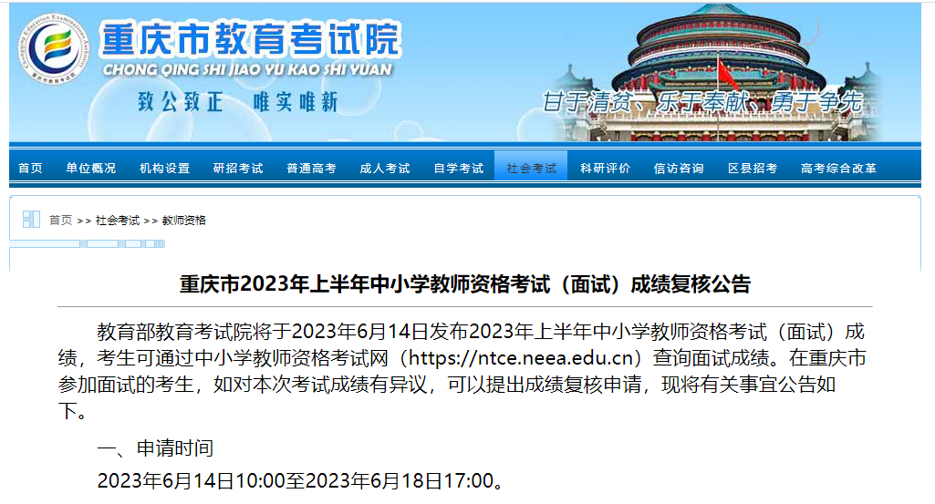 教育部教育考试院将于2023年6月14日发布2023年上半年中小学教师资格考试(面试)成绩,考生可通过中小学教师资格考试网(https://ntce.neea.edu.cn)查询面试成绩。在重庆市参加面试的考生,如对本次考试成绩有异议,可以提出成绩复核申请,现将有关事宜公告如下。