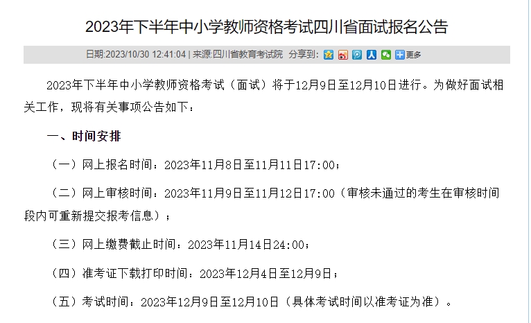 2023年下半年中小学教师资格考试四川省面试报名时间相关内容如下: