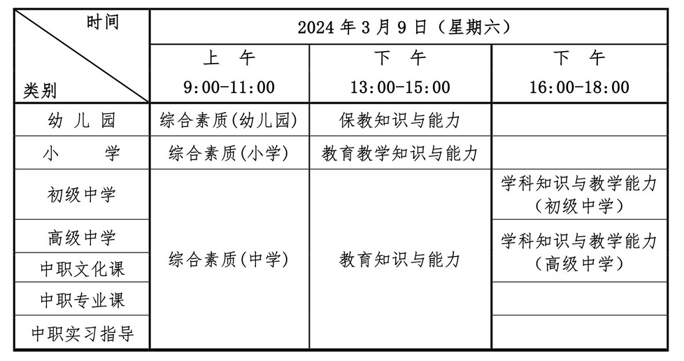 3.选择初中、高中、中职文化课类别中“心理健康教育”“日语”“俄语”学科的考生,笔试科目三《学科知识与教学能力》暂不考试,结合面试一并考核;选择小学类别中“心理健康教育”“信息技术”“小学全科”的考生,笔试科目为《综合素质》(代码:201)和《教育教学知识与能力》(代码:202)。