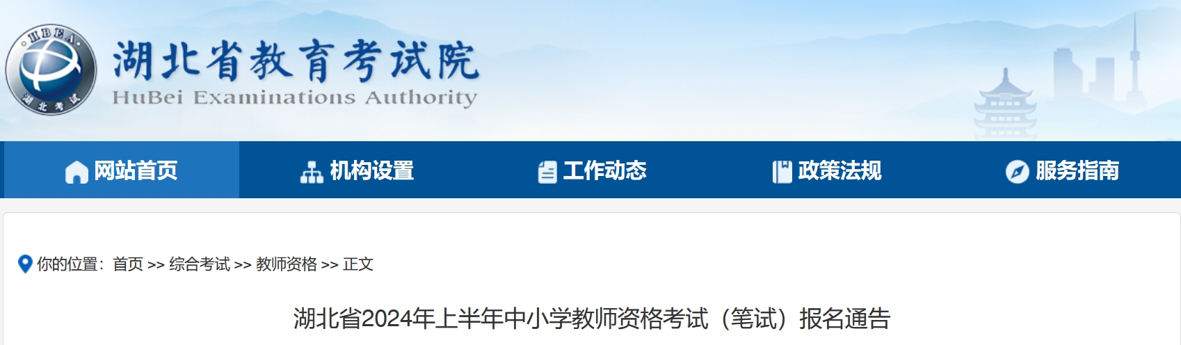 湖北省教育考试院近日发布《湖北省2024年上半年中小学教师资格考试(笔试)报名通告》,公告中明确了2024年上半年湖北省教师资格笔试时间安排、报考条件及要求、报名资格审核相关事宜,本次报名2024年1月12日9:00至15日16:00进行,提醒考生及时报名。