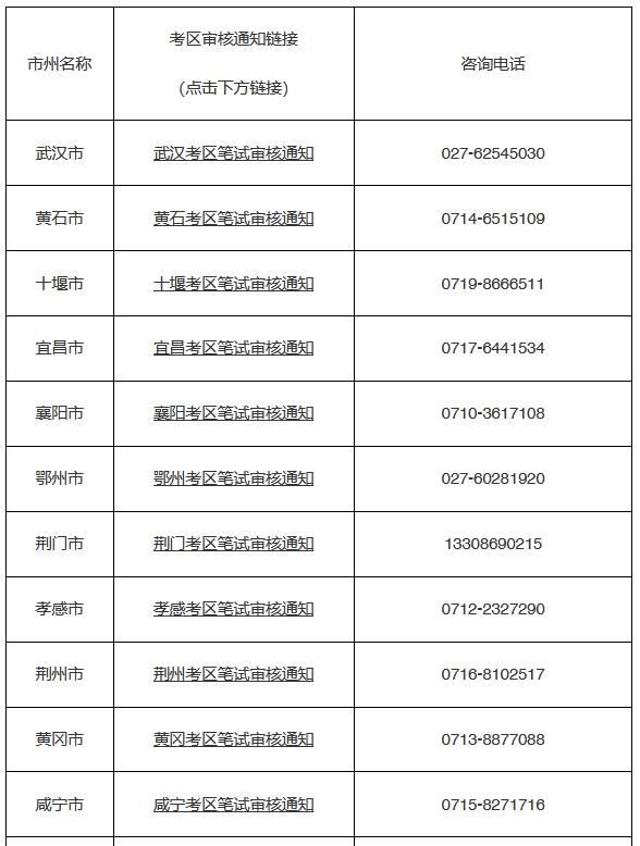 我省中小学教师资格考试(笔试)报名的资格审核由各考区根据实际情况进行安排。请考生务必点击下表中所报考考区审核通知链接,并认真阅读考区的审核安排。报名提交后,须密切关注自己的审核状态,若“待审核”状态超过24小时,应及时自查是否未按考区审核通知的要求提交相关材料或未去现场审核。如有疑问,请拨打考区咨询电话。