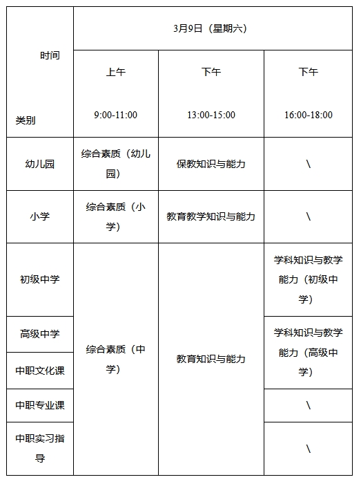 (四)全国统一考试时间为3月9日,各类别考试科目与时间安排如下: