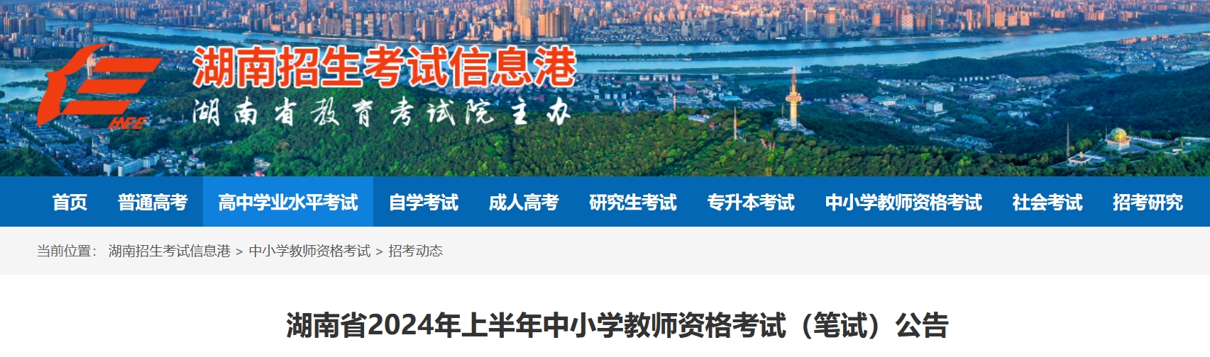 湖南招生考试信息港近日发布《湖南省2024年上半年中小学教师资格考试(笔试)公告》,公告中明确了2024年上半年湖南教师资格笔试考试报考须知、考试安排、报考条件、报名流程等相关信息,本次网上报名时间为1月12日8时至15日17时,提醒考生及时报名。