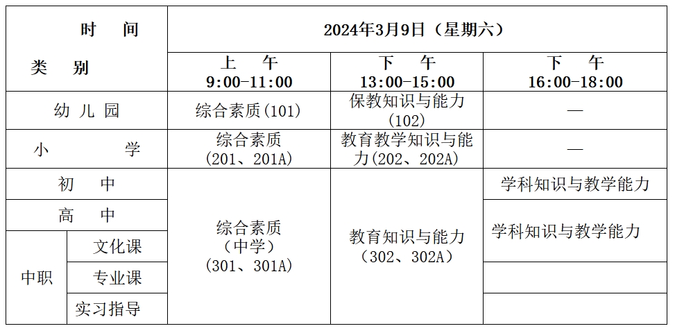 (一)初中、高中、中职文化课类别的 “心理健康教育”、“日语”、“俄语”专业,笔试科目为初、高中《综合素质》(代码:301)和《教育知识与能力》(代码:302),以上科目的学科知识与教学能力暂不进行笔试,在面试时一并考核。