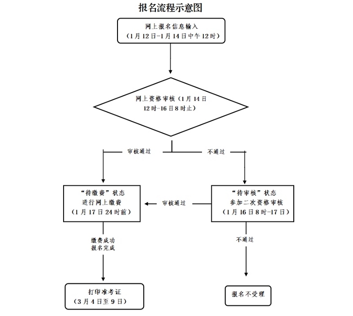(1)网上资格审核未通过者(1月16日8:00后报名网站上仍显示为“待审核”状态的),如认为自己符合报考条件的,可持有关证明(证件)材料,按照各考区公布的要求进行二次资格审核,二次审核截止时间为1月17日(具体安排见各考区公告)。
