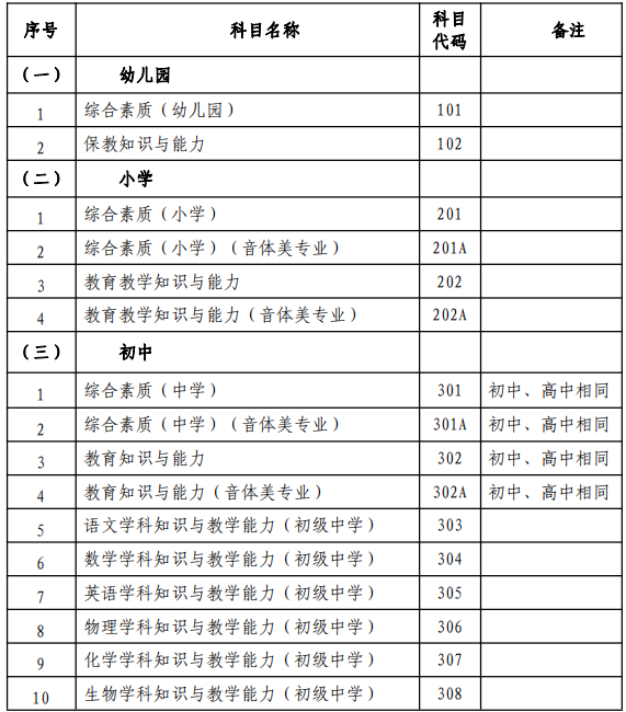 (三)报考小学、初级中学、普通高级中学、中职文化课类别音、体、美专业的考生,笔试科目一和科目二的代码为201A、202A、301A、302A。取得201A、202A科目合格的考生,面试仅限于参加小学类别音、体、美专业科目;取得301A、302A科目合格的考生,面试仅限于参加初中、高中、中职文化课类别音、体、美专业科目。考生获得201、202、301、302科目合格成绩,可相应替代201A、202A、301A、302A科目合格成绩,参加对应类别音、体、美专业科目面试;考生获得201A、202A、301A、302A科目合格成绩不可替代201、202、301、302科目合格成绩。