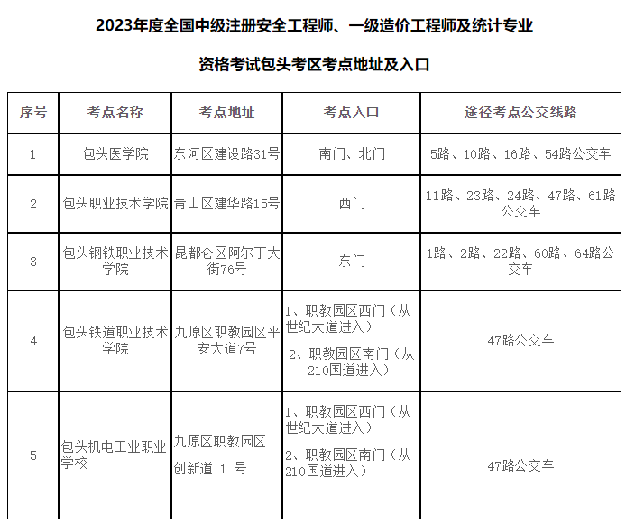 三、请提前熟悉考点地址、交通路线。本周考试考点设在包头医学院、包头职业技术学院、包头钢铁职业技术学院、包头铁道职业技术学院和包头机电工业职业学校。请广大考生认真阅读准考证上考点地址信息,提前了解考点入口位置和前往路线,做好考试当天的出行安排。包头医学院、包头职业技术学院、包头钢铁职业技术学院禁止考生车辆、社会车辆进入校园,建议考生尽量乘坐公共交通工具或由家人送达等方式出行;包头铁道职业技术学院和包头机电工业职业学校考生车辆可以进入职教园区(出租车禁止进入园区),如考生乘坐出租车,请留出从园区大门至考点的时间(步行大约30分钟)。为确保道路畅通,考试当天交管部门将在考点附近及道路沿线增派交警,请考生配合交警工作。
