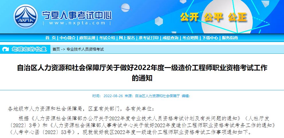 宁夏人事考试中心发布的2022年一级造价师报名通知