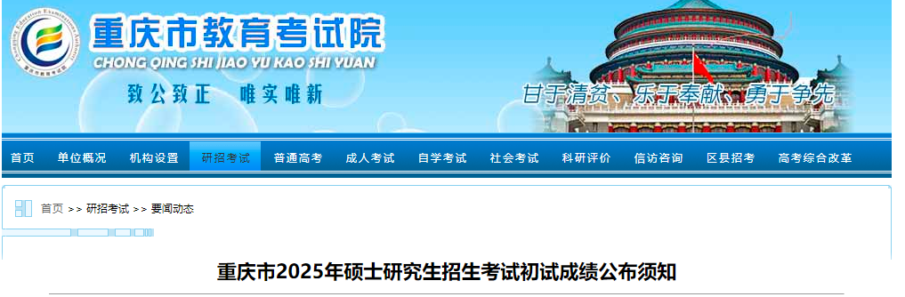 2025年2月17日,重庆市教育考试院发布《重庆市2025年硕士研究生招生考试初试成绩公布须知》,明确报考重庆市硕士研究生招生单位的考生可于2025年2月24日9:00起查询初试成绩。