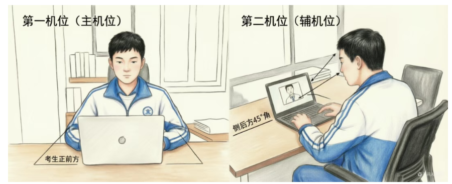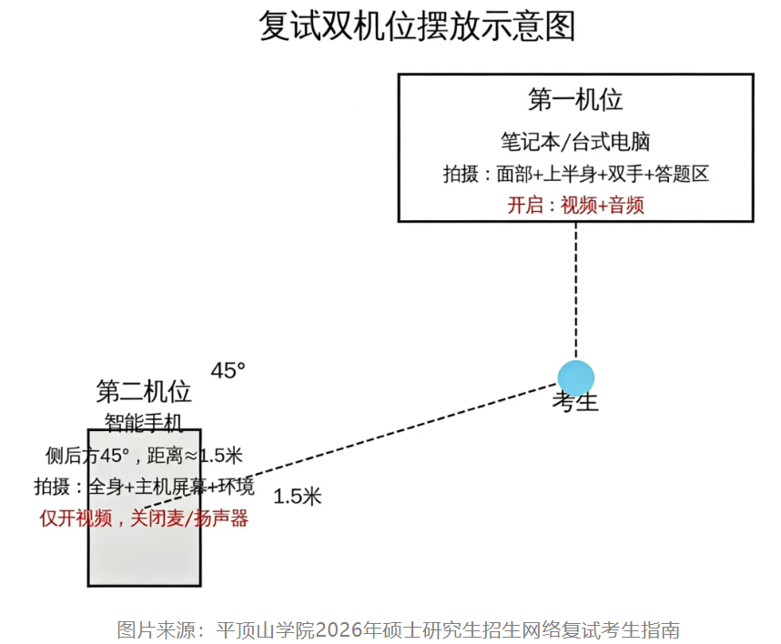考生一般采用“双机位”模式参加复试,即需要两部带摄像头的设备。用于面试设备(主机位)建议使用一台笔记本(或台式电脑+外接高清摄像头和外接麦克风或智能手机),不可使用耳机。用于监控面试环境的设备(辅机位)为一部智能手机,建议准备手机支架。考生双手摆放桌面,第一机位从正面拍摄,放置在距离本人30cm处,完整拍摄到考生双手以上身体部位。第二机位从考生侧/后方45°距离本人1.5m左右处拍摄,可以拍摄到考生侧面及主设备电脑全屏幕。