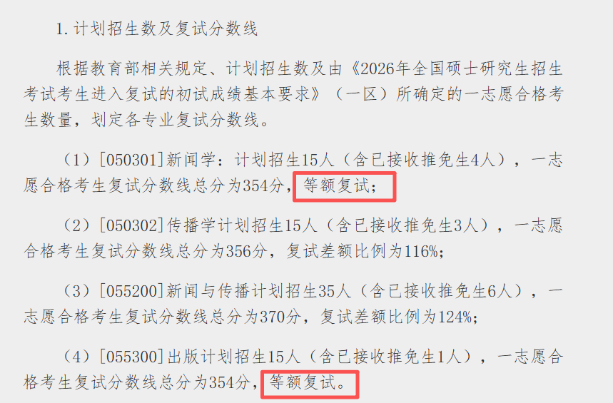 辽宁大学新闻与传播学院2026年硕士研究生复试工作实施细则中,新闻学、出版等专业等额复试。
