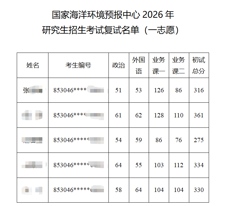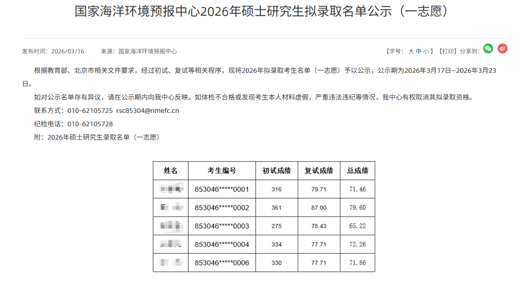 国家海洋环境预报中心26年进复试的五名同学全部拟录取。