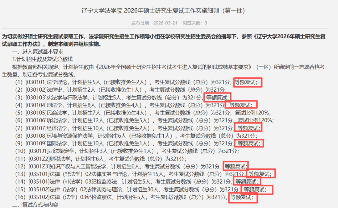 辽宁大学法学院 2026年硕士研究生复试工作实施细则(第一批)中,大部分专业为等额复试。