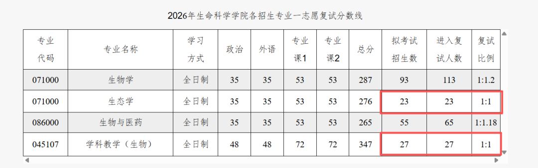 河南大学生命科学学院2026年硕士研究生招生复试录取工作实施细则中,生态学、学科教学(生物)等专业等额复试