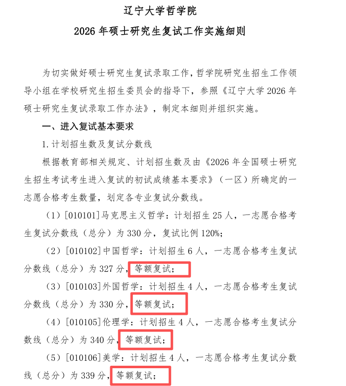 辽宁大学哲学院2026年硕士研究生复试工作实施细则中,中国哲学、外国哲学等专业等额复试