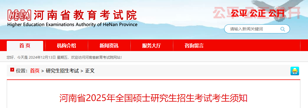 2024年12月12日,河南省教育考试院发布《河南省2025年全国硕士研究生招生考试考生须知》,提醒考生做好考前准备,确保顺利参加初试,小编将详情整理如下,请参阅。