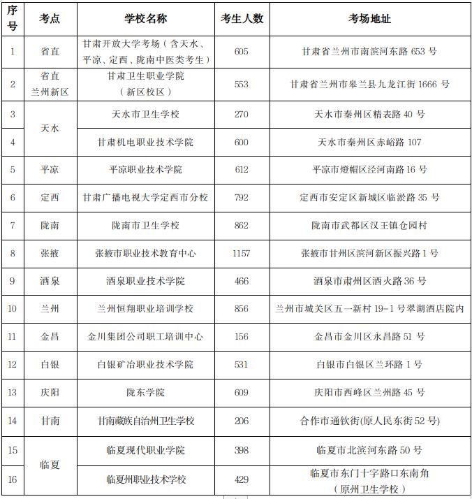 1.由于考场冲突原因,武威考点全部考生合并至张掖考点参加考试;嘉峪关考点全部考生合并至酒泉考点参加考试;天水、平凉、定西、陇南中医类别考生统一调至省直考点甘肃开放大学考场参加考试。