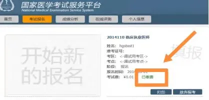 考生最终缴费成功的标志,以国家医学考试中心官网考生服务端中的“已缴费”为准。(如下图)
